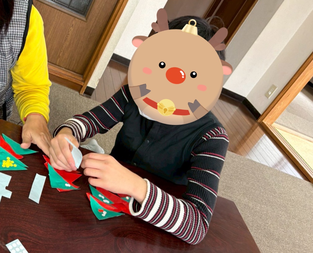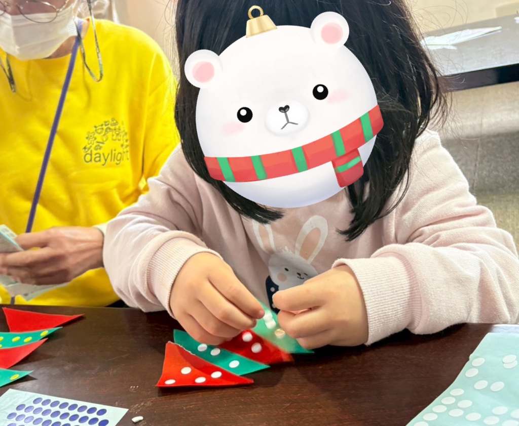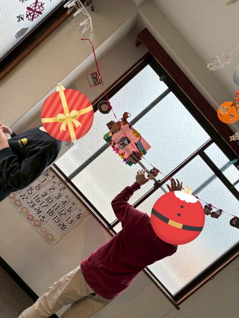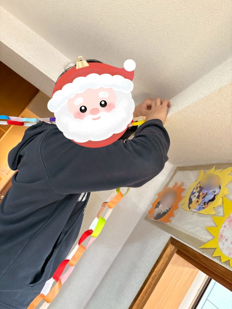 ツリーの形の飾りを作ってもらったり、大きいお姉さん、お兄さんたちには壁に輪飾りなどの装飾をつけてもらったりとたくさん手伝ってもらっています🙌